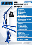 Для профессионального применения. Вес: 83 кг. Складной. Грузоподъемность 2т. Рабочий диапазон стрелы 1030-1580 мм. Высота подъёма крана от пола цеха – 170÷2300 мм. Для подъема и транспортировки автомобильных узлов, агрегатов и любых других грузов как внутри помещения, так и на улице. Вынос стрелы регулируется в соответствии с максимальной грузоподъемностью крана – 500-1000-1500-2000кг.
