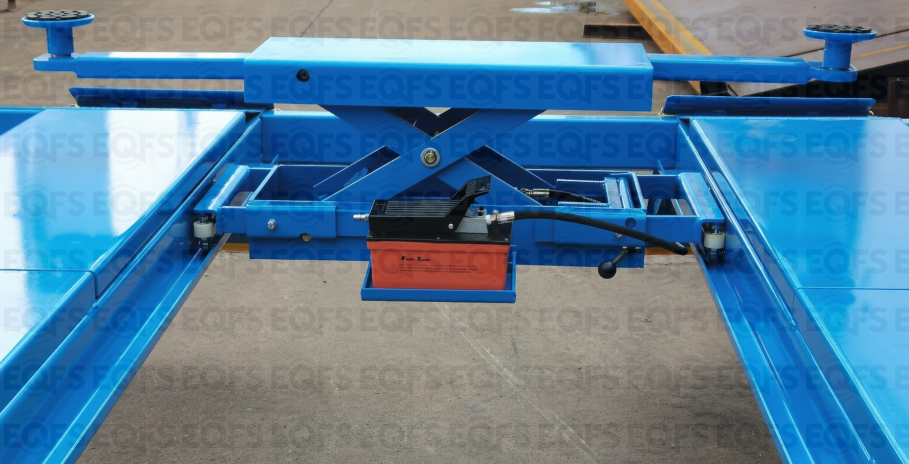 Пневматический привод насоса позволяет точно регулировать высоту подъема. Подъемник канавный снабжен стопорным механизмом, который предотвращает падение автомобиля во время проведения работ.