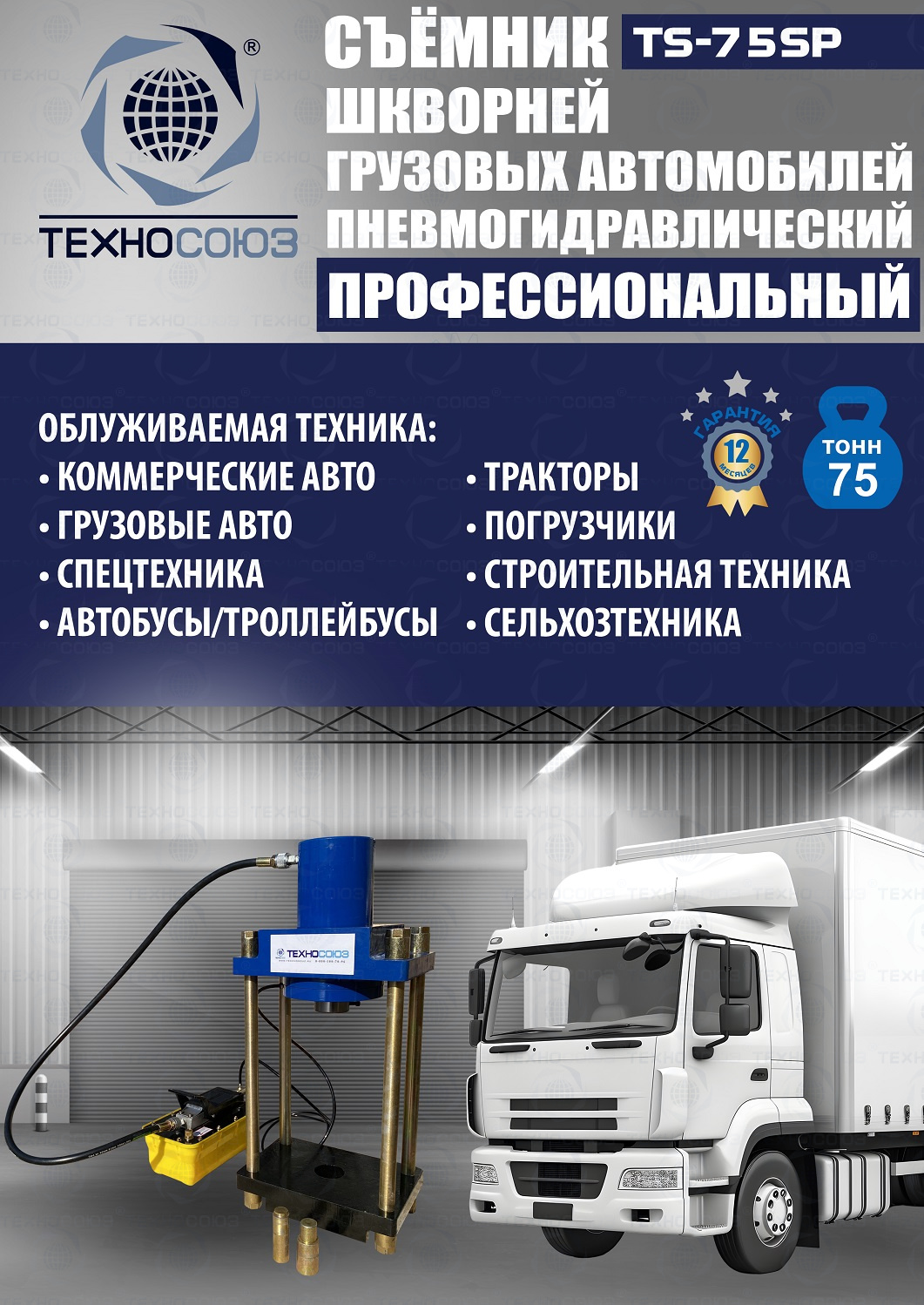 Сокращает время ремонта. Позволяет работать под разными углами. Для выпрессовки шкворней из поворотной цапфы погрузчиков, тракторов, строительной техники, коммерческих и грузовых авто отечественного и импортного производства: MAN, MERCEDES, SCANIA, VOLVO, Корейские и Китайские авто. Пневмогидравлический привод. Рабочее окно 400x320 мм. Усилие 75 тонн.