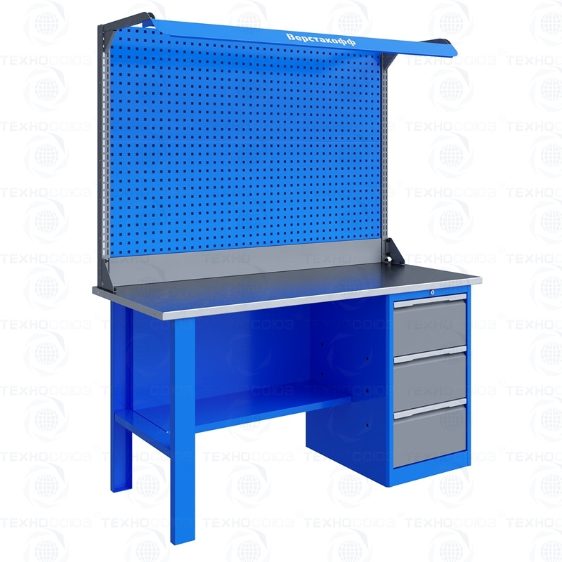 Однотумбовый. Допустимая нагрузка на столешницу 750 кг. Опорные элементы выполнены сварными из холоднокатаной стали. Для выполнения сборочных, ремонтных, слесарных, монтажных и других видов работ на производстве, в сервисных центрах, мастерских, гаражах, а также для обучения технологии в учебных заведениях. Комплектуется полкой-стенкой, расположенной под столешницей для удобного размещения габаритного инструмента и оснастки. Размеры верстака: 855x1596x696 мм. Вес: 81 кг. Поставляется в 4 комплектациях на выбор.